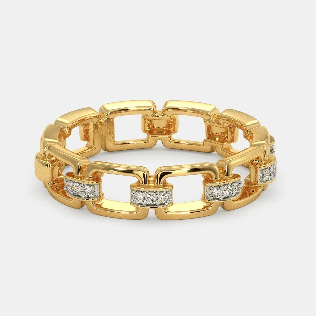 This exquisite band ring features a modern chain-link design, crafted in pure silver exudes sophistication. Each link is meticulously detailed, with alternating sections adorned with shimmering pavé-set diamonds, adding a touch of luxury and brilliance. The bold and unique structure makes this ring an ideal choice for both men and women, perfectly blending timeless elegance with contemporary flair.