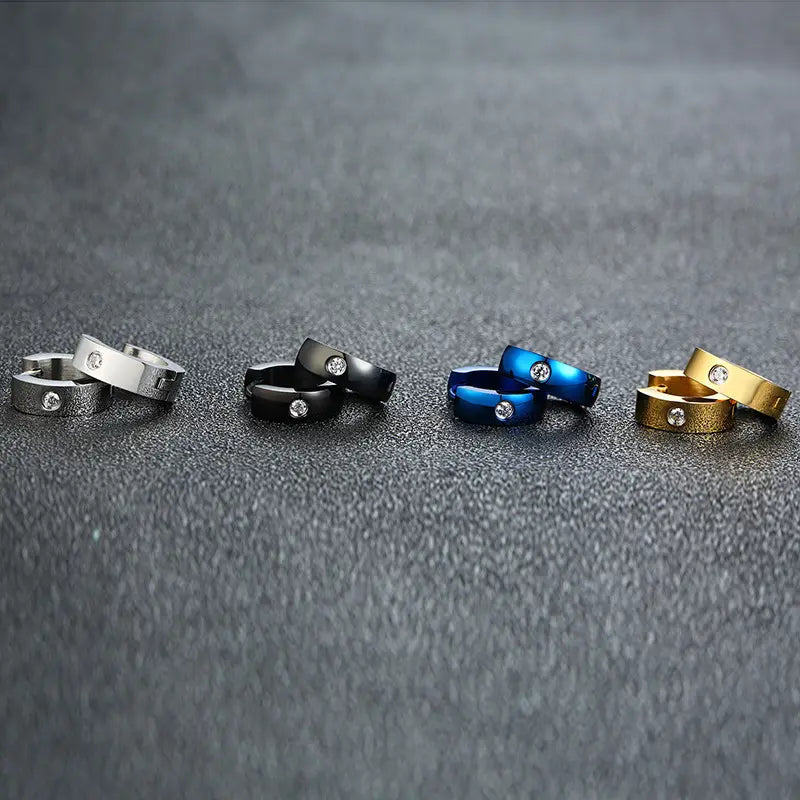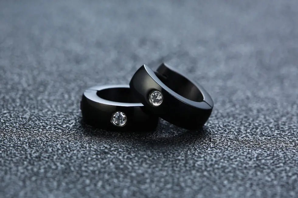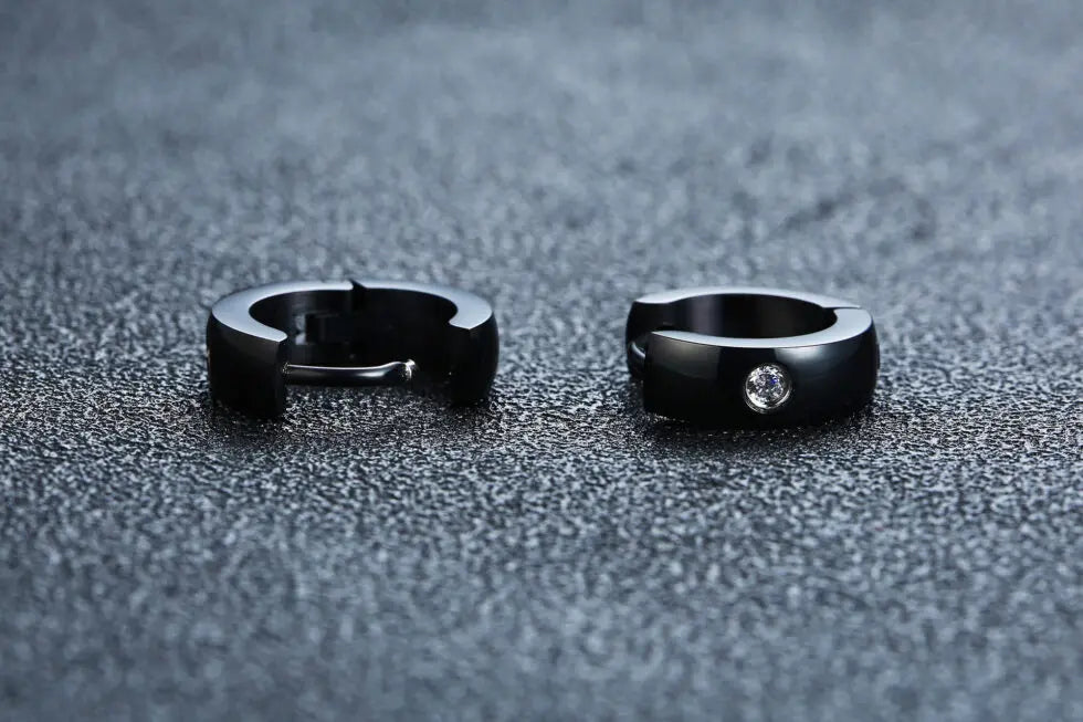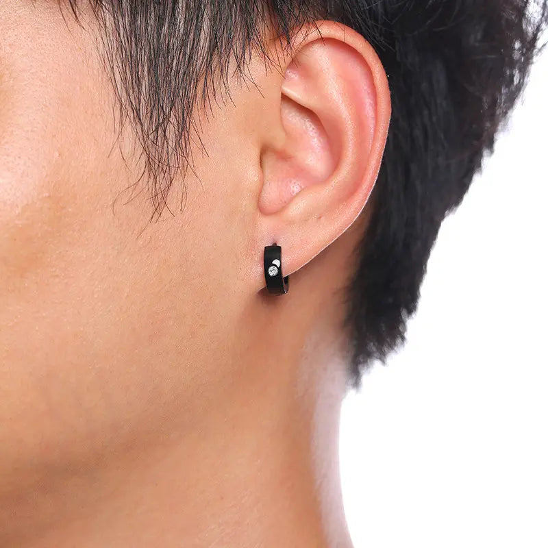 Sterling Stone Round Edge Men Earring Mini Hoop – Black – a sleek and sophisticated earring designed for men who appreciate style with a touch of refinement. Crafted from premium grade 316 stainless steel , this mini hoop features a subtle embedded stone that adds a captivating sparkle to your look. Its minimalist design and versatile appeal make it suitable for any occasion, seamlessly elevating your style. With a secure clasp for comfort and durability, the Gleamstone Hoop is a timeless accessory that effortlessly complements your unique fashion sense.